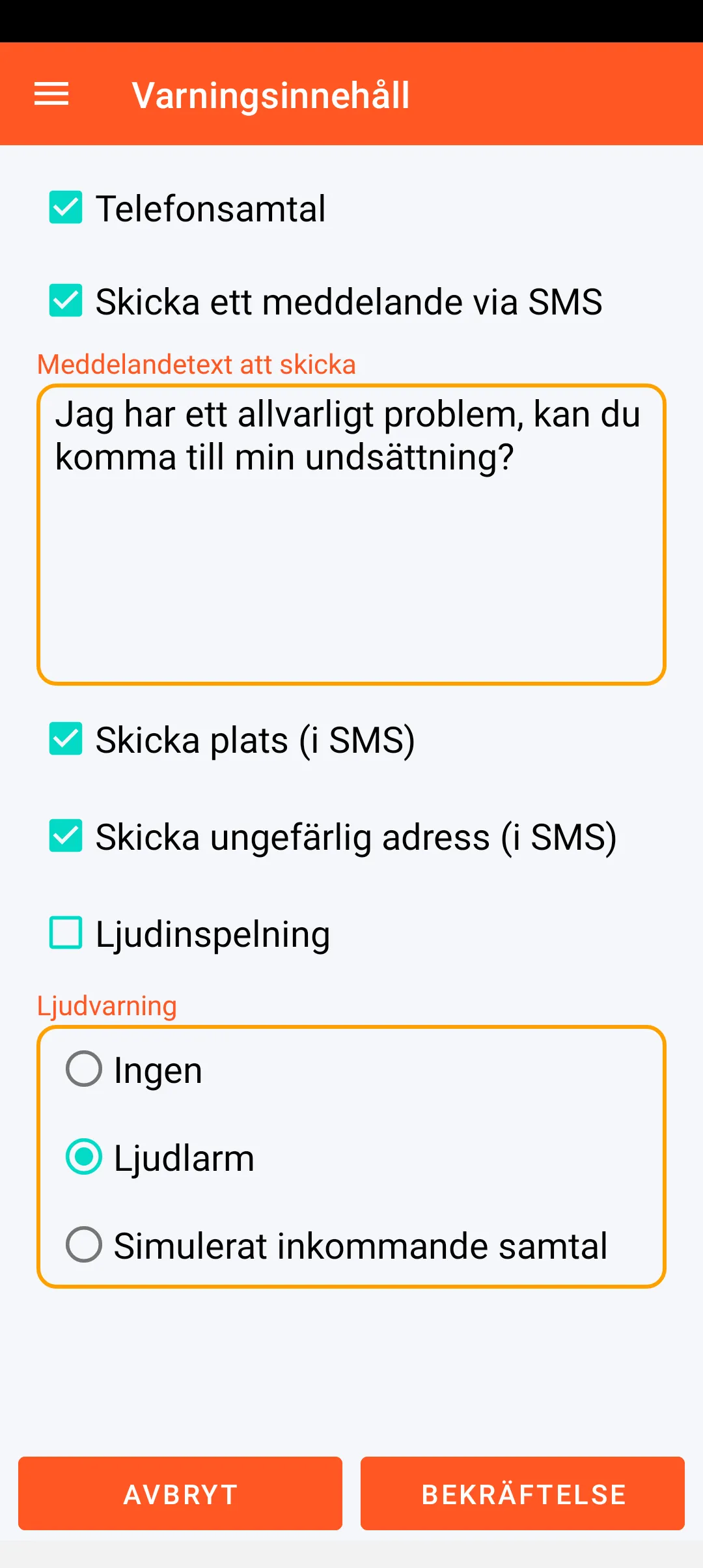 Varningen kan definieras genom ett telefonsamtal och utskick av ett SMS som kan innehålla (förutom meddelandets text) den geografiska positionen (länk till en GoogleMaps- eller OpenStreetMap-karta) samt motsvarande adress. Denna varning kan även utlösa en ljudinspelning, ett ljudlarm eller en simulering av ett inkommande telefonsamtal.