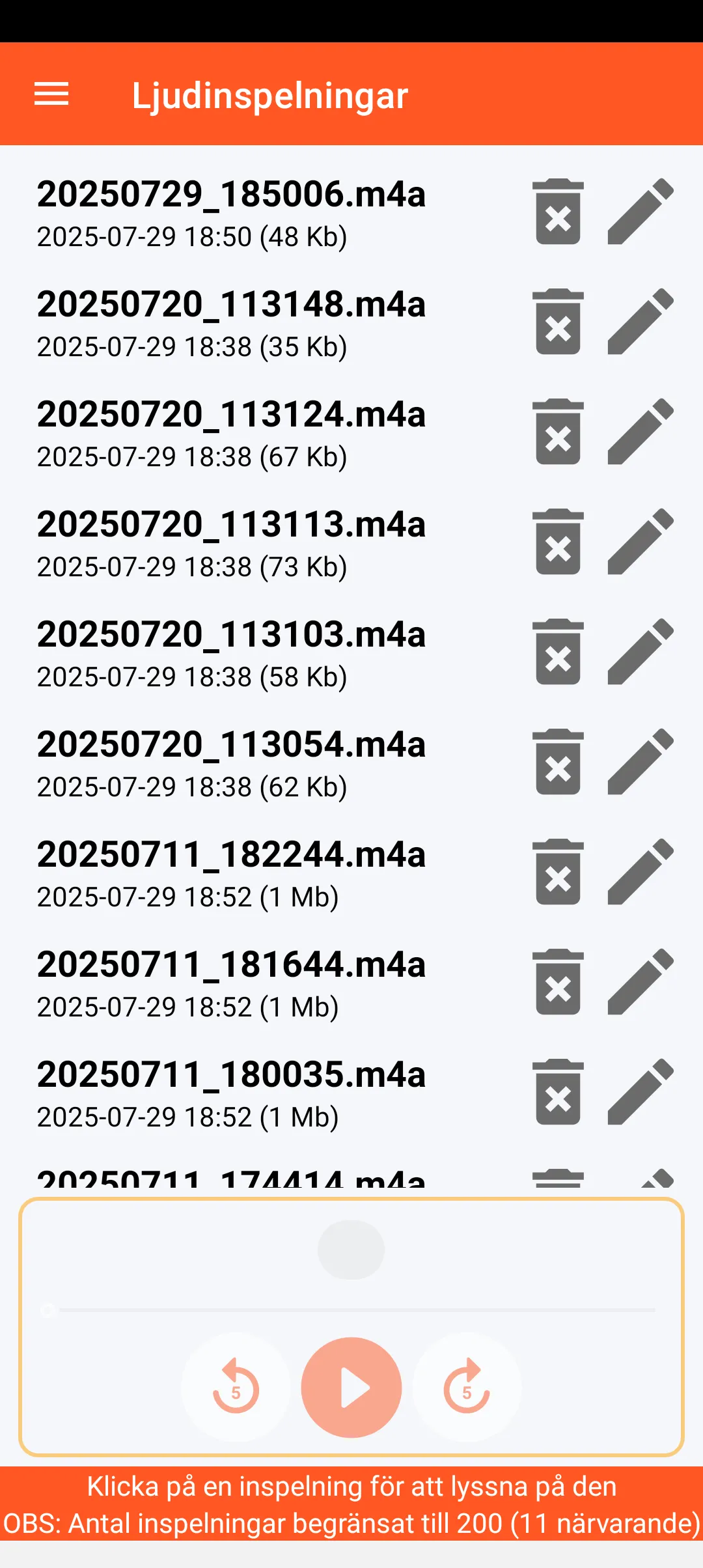 Du kan spara upp till 200 ljudinspelningar som lagras i smarttelefonens nedladdningskatalog. Varje inspelning är tidsstämplad och kan lyssnas på, döpas om eller raderas.