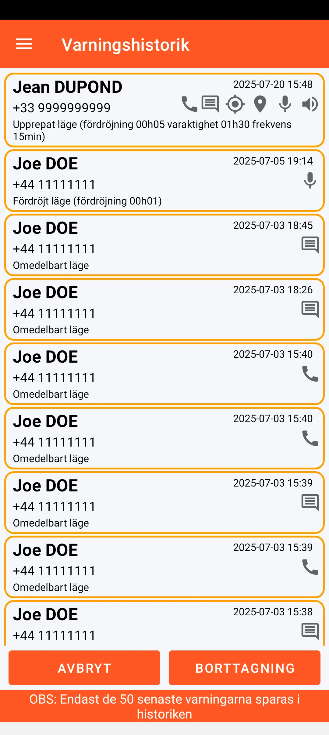 De 50 senaste skickade varningarna sparas i historiken med alla deras egenskaper (namn på den varnade kontakten, datum och tid samt varningsinnehåll och -läge).