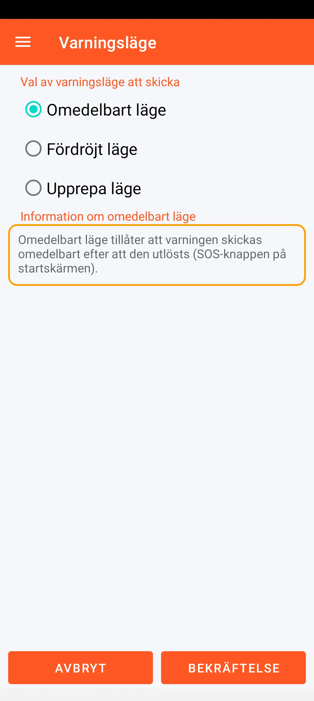 Det omedelbara läget tillåter att varningen skickas omedelbart efter att den utlösts (SOS-knappen på startskärmen).