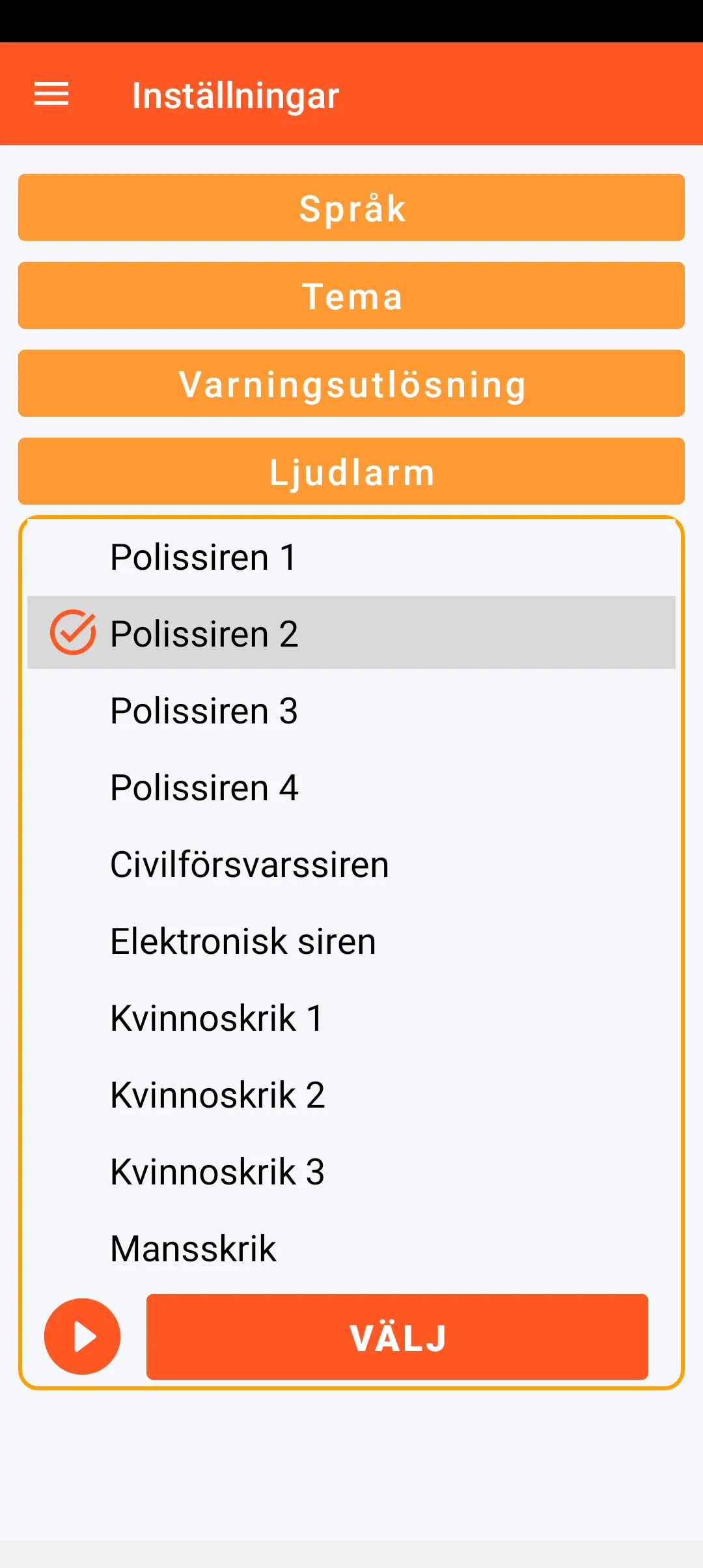 När det gäller valet av ljudlarm har du tillgång till 6 sireninspelningar och 4 mänskliga skrik.