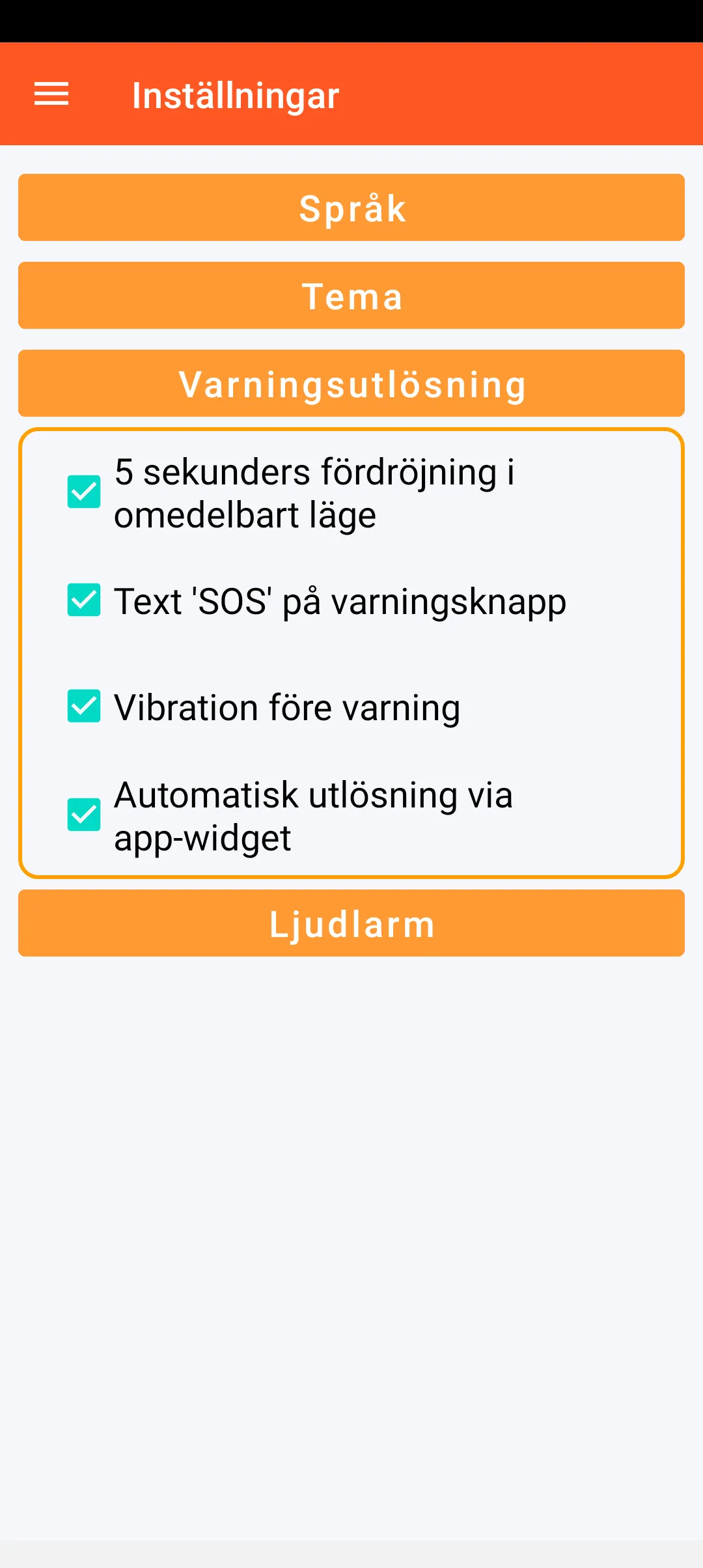 Du kan också göra olika inställningar relaterade till larmutlösningen (5 sekunders fördröjning i omedelbart läge, visning eller inte av texten på larmknappen, eventuell vibration innan larmet skickas och automatisk utlösning av detta larm från en app-widget, direkt från startskärmen på din smartphone).