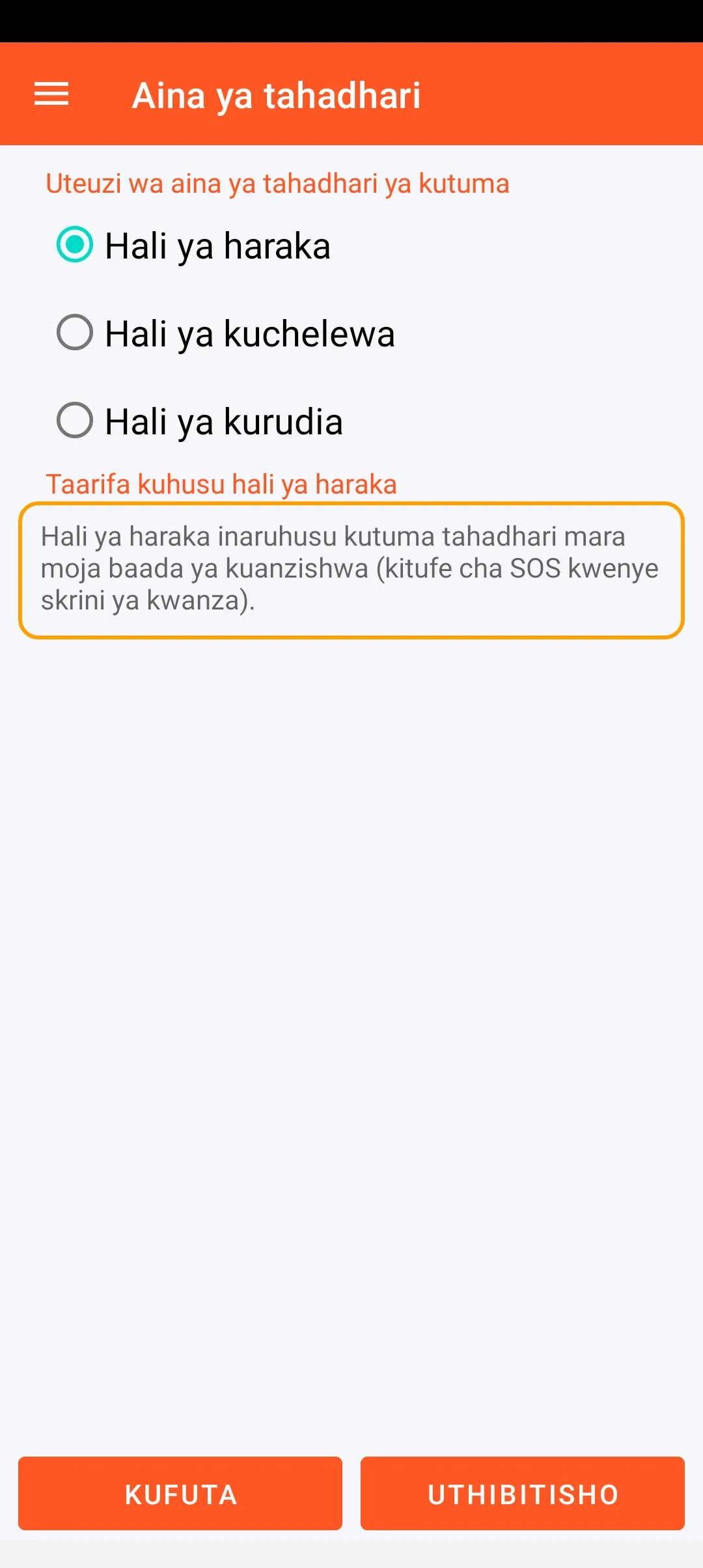 Hali ya haraka inaruhusu kutuma tahadhari mara moja baada ya kuanzishwa (kitufe cha SOS kwenye skrini ya kwanza).