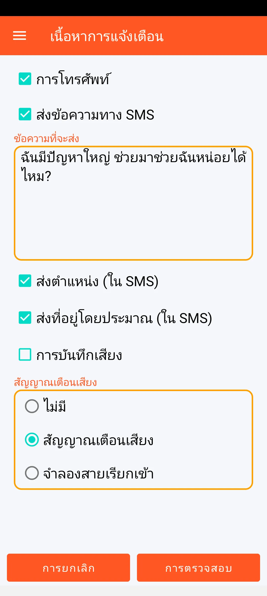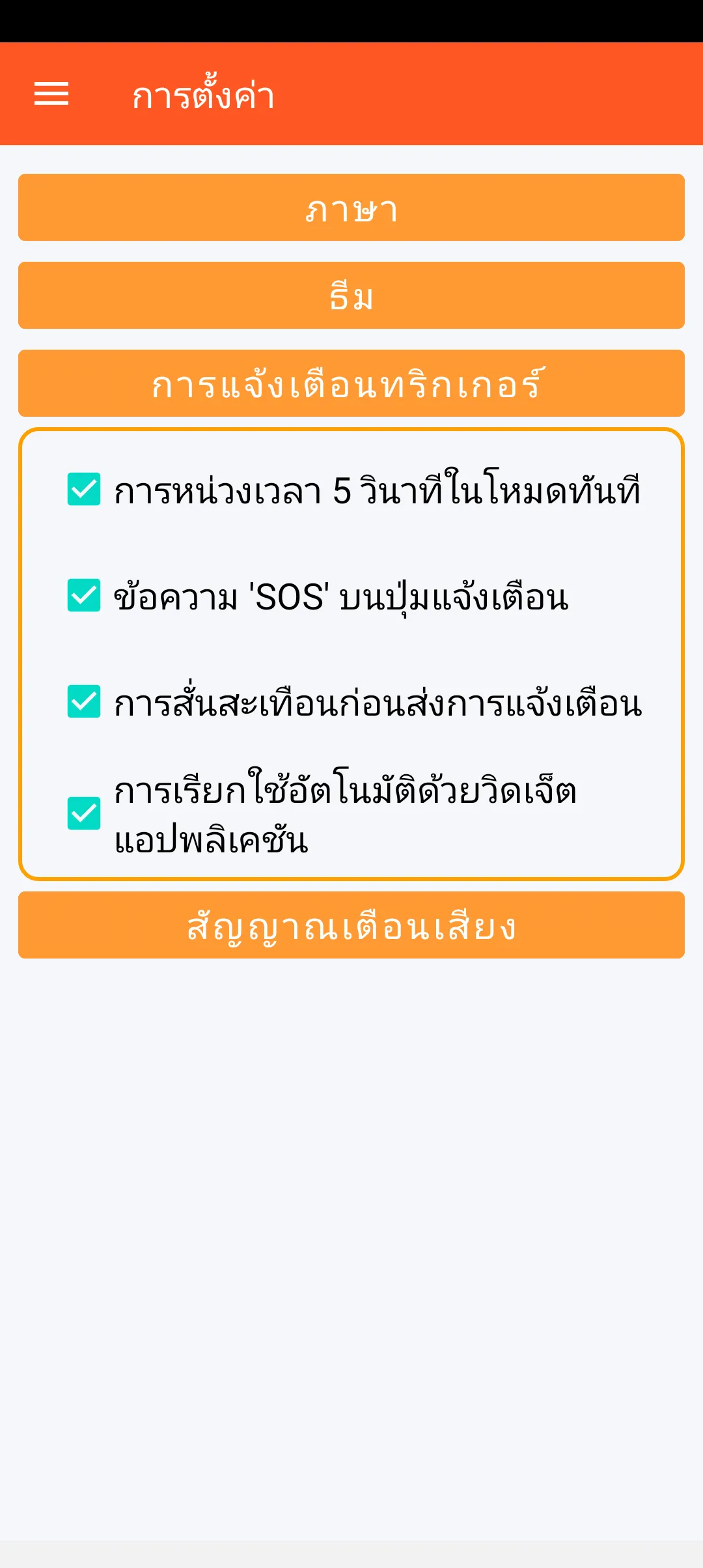 คุณยังสามารถทำการตั้งค่าต่างๆ ที่เกี่ยวข้องกับการเรียกใช้การแจ้งเตือน (การหน่วงเวลา 5 วินาทีในโหมดทันที การแสดงหรือไม่แสดงข้อความบนปุ่มแจ้งเตือน การสั่นสะเทือนก่อนส่งการแจ้งเตือน และการเรียกใช้การแจ้งเตือนนี้โดยอัตโนมัติจากวิดเจ็ตแอปพลิเคชัน โดยตรงจากหน้าจอหลักของสมาร์ทโฟนของคุณ)