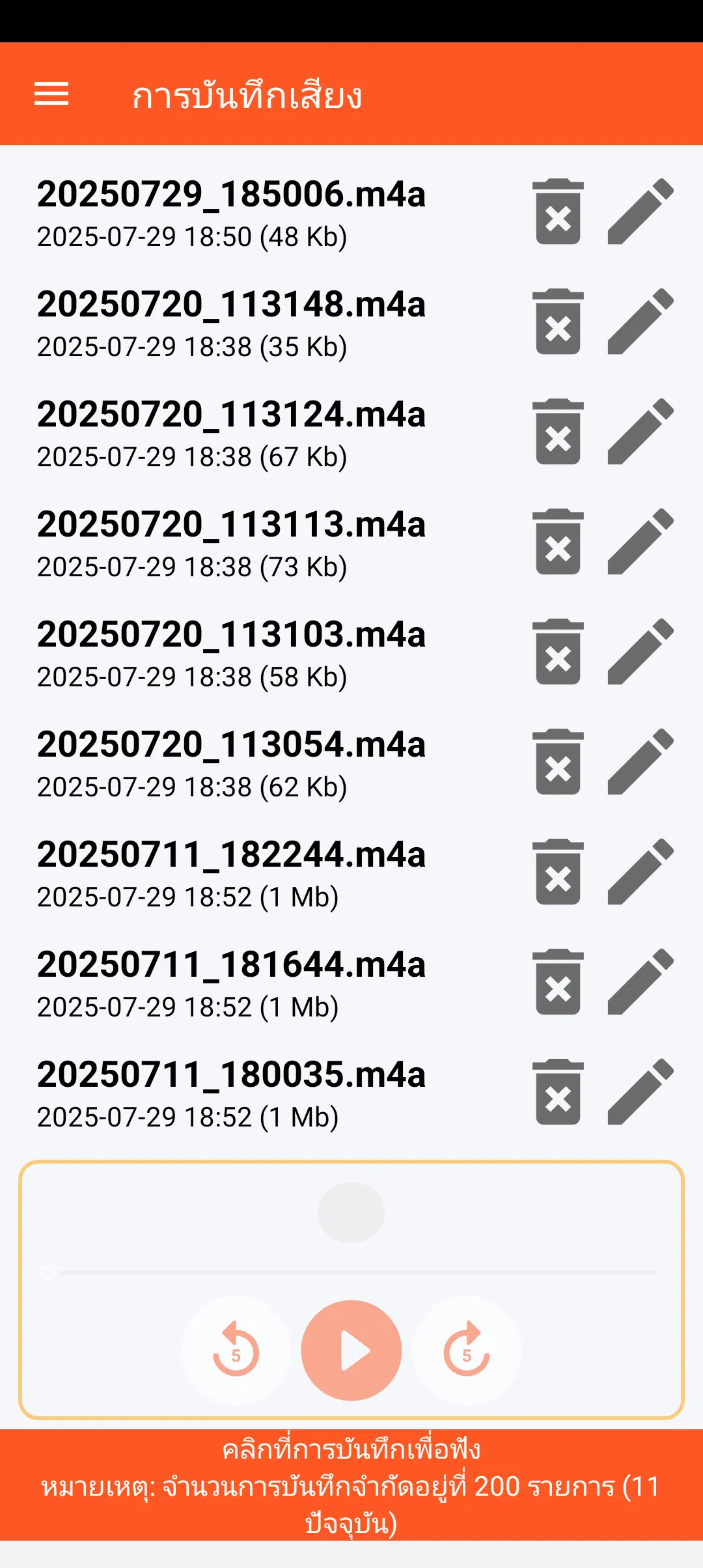 คุณสามารถเก็บไฟล์เสียงได้สูงสุด 200 ไฟล์ซึ่งจัดเก็บไว้ในไดเรกทอรีดาวน์โหลดของสมาร์ทโฟนของคุณ ไฟล์เสียงแต่ละไฟล์จะมีการประทับเวลาและสามารถฟัง เปลี่ยนชื่อ หรือลบได้