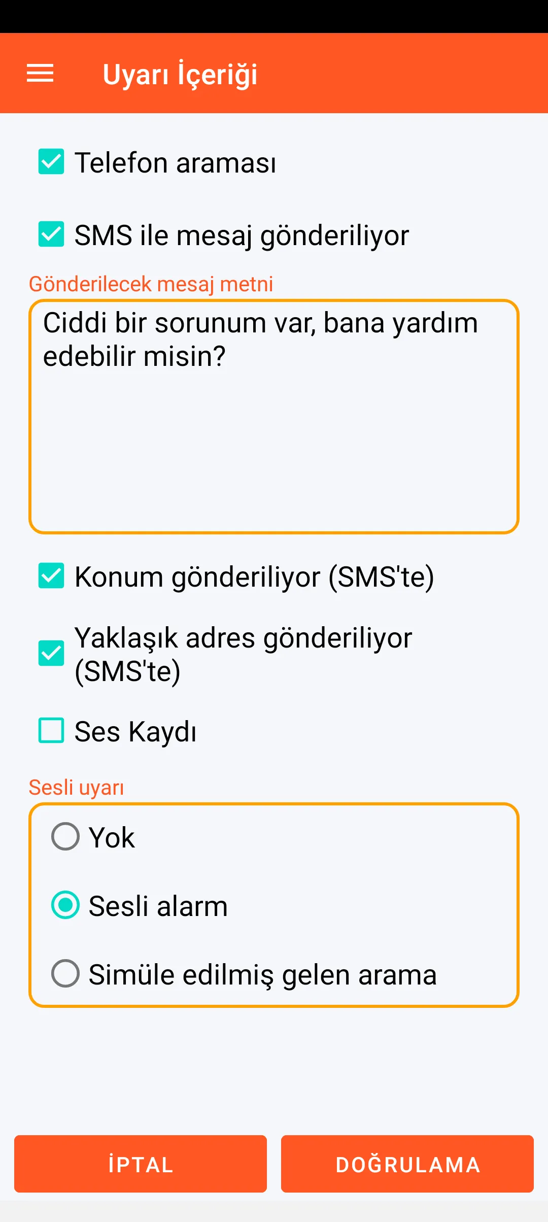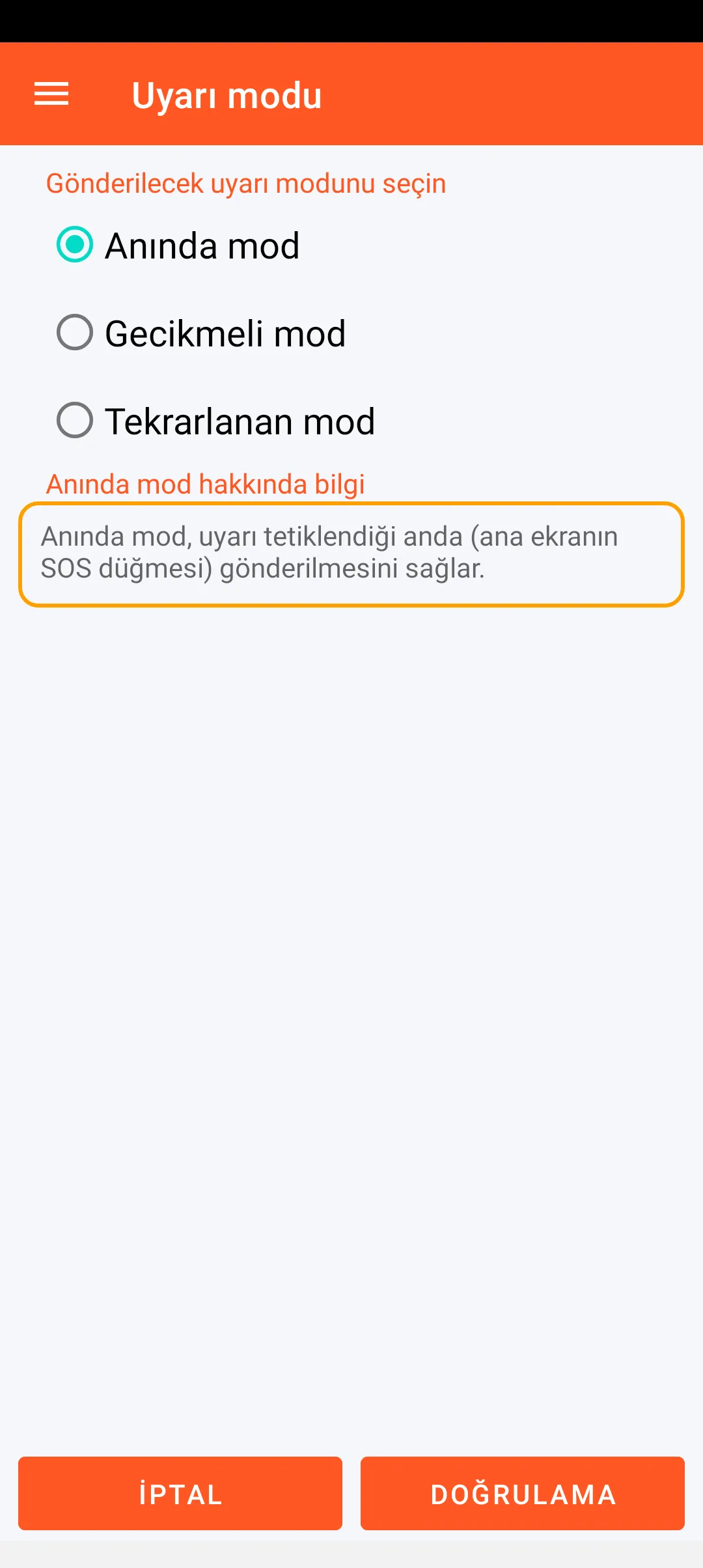 Anında mod, uyarı tetiklendiği anda (ana ekranın SOS düğmesi) gönderilmesini sağlar.