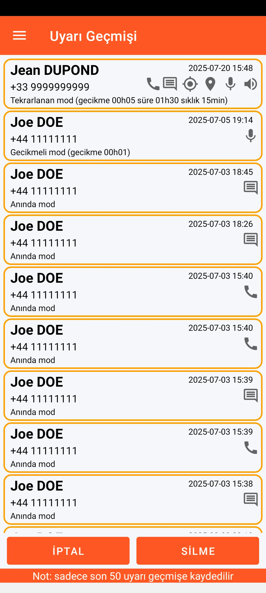 Son 50 gönderilen uyarı, tüm özellikleriyle (uyarılan kişinin adı, tarih ve saat ile içerik ve uyarı modu) geçmişe kaydedilir.
