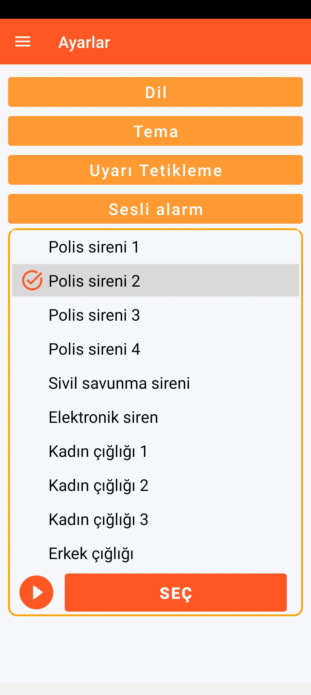 Sesli alarm seçimi ile ilgili olarak, 6 siren kaydı ve 4 insan çığlığı kaydı mevcuttur.