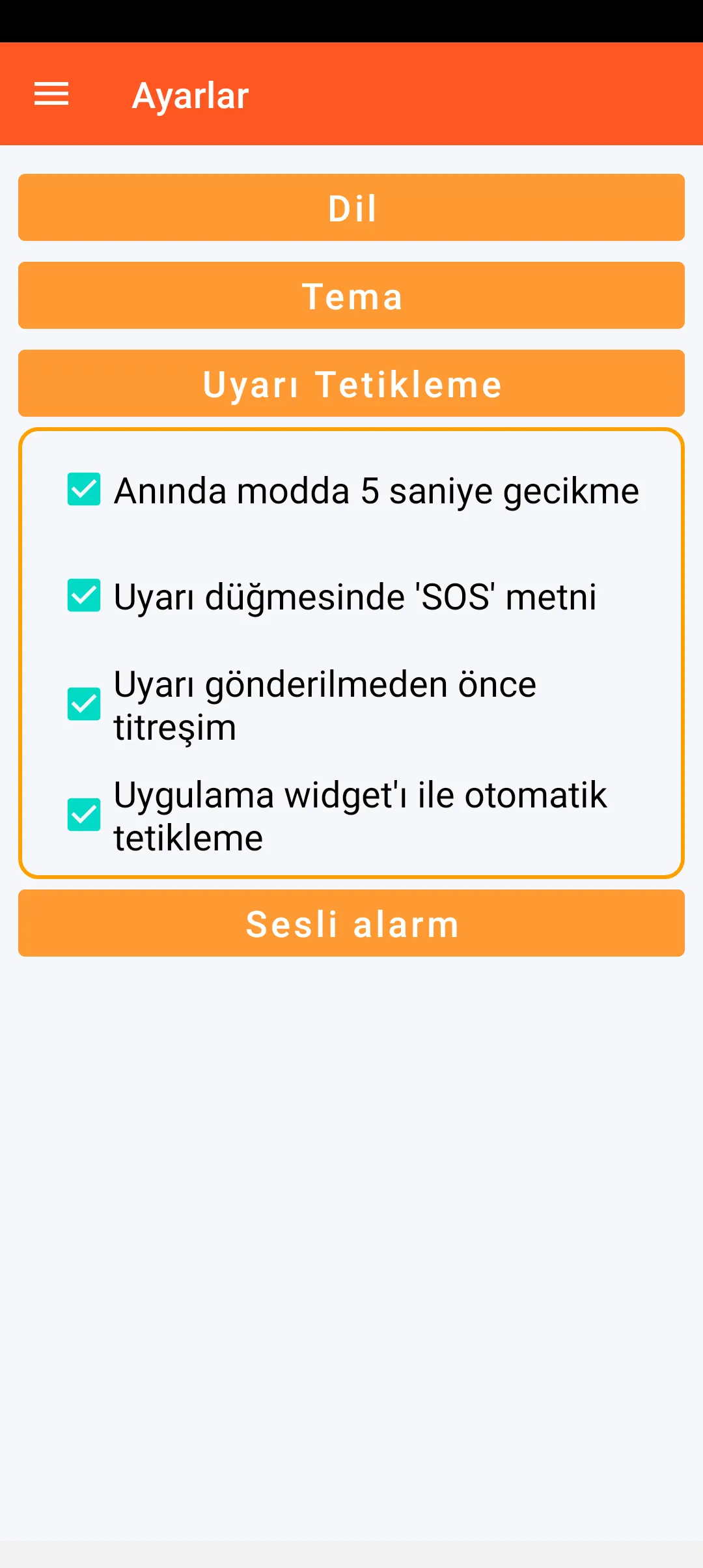 Ayrıca, uyarı tetiklenmesiyle ilgili çeşitli ayarlar yapabilirsiniz (anlık modda 5 saniyelik gecikme, uyarı düğmesinde metnin gösterilmesi veya gösterilmemesi, uyarı gönderilmeden önce olası bir titreşim yayılması ve bu uyarının doğrudan akıllı telefonunuzun ana ekranından bir uygulama widget’ından otomatik olarak tetiklenmesi).