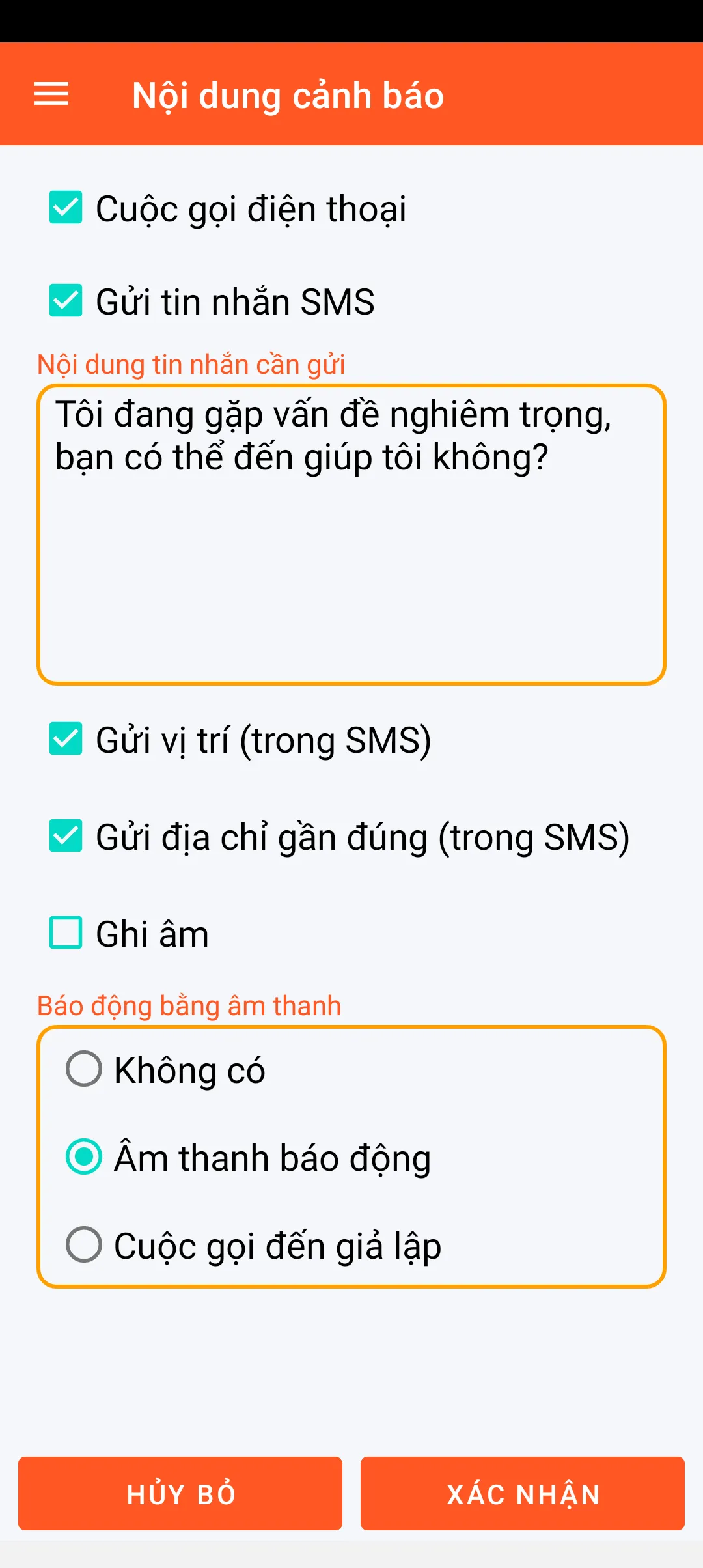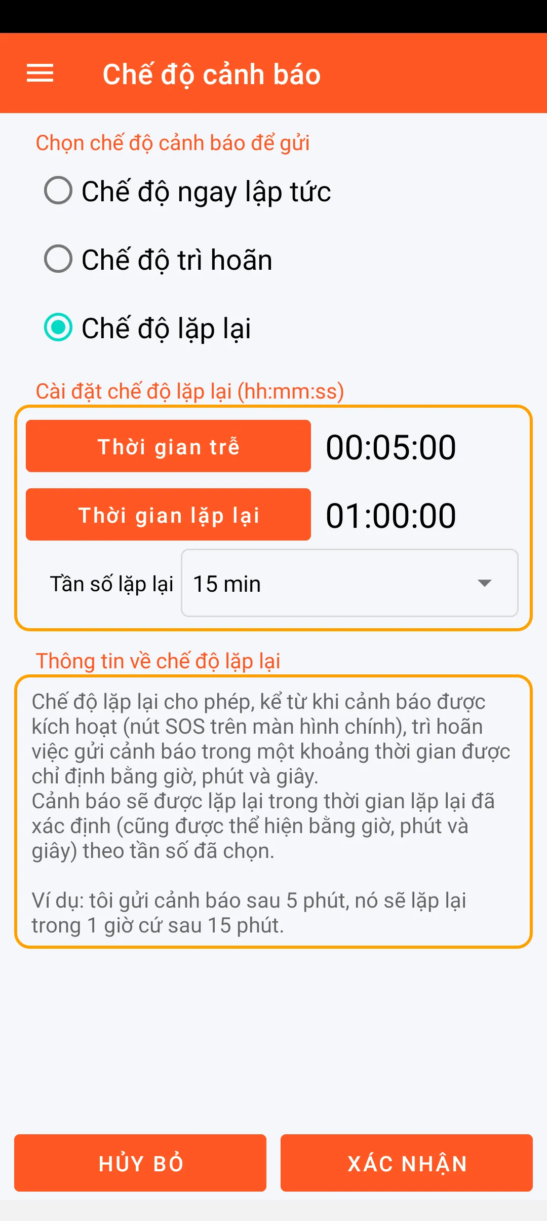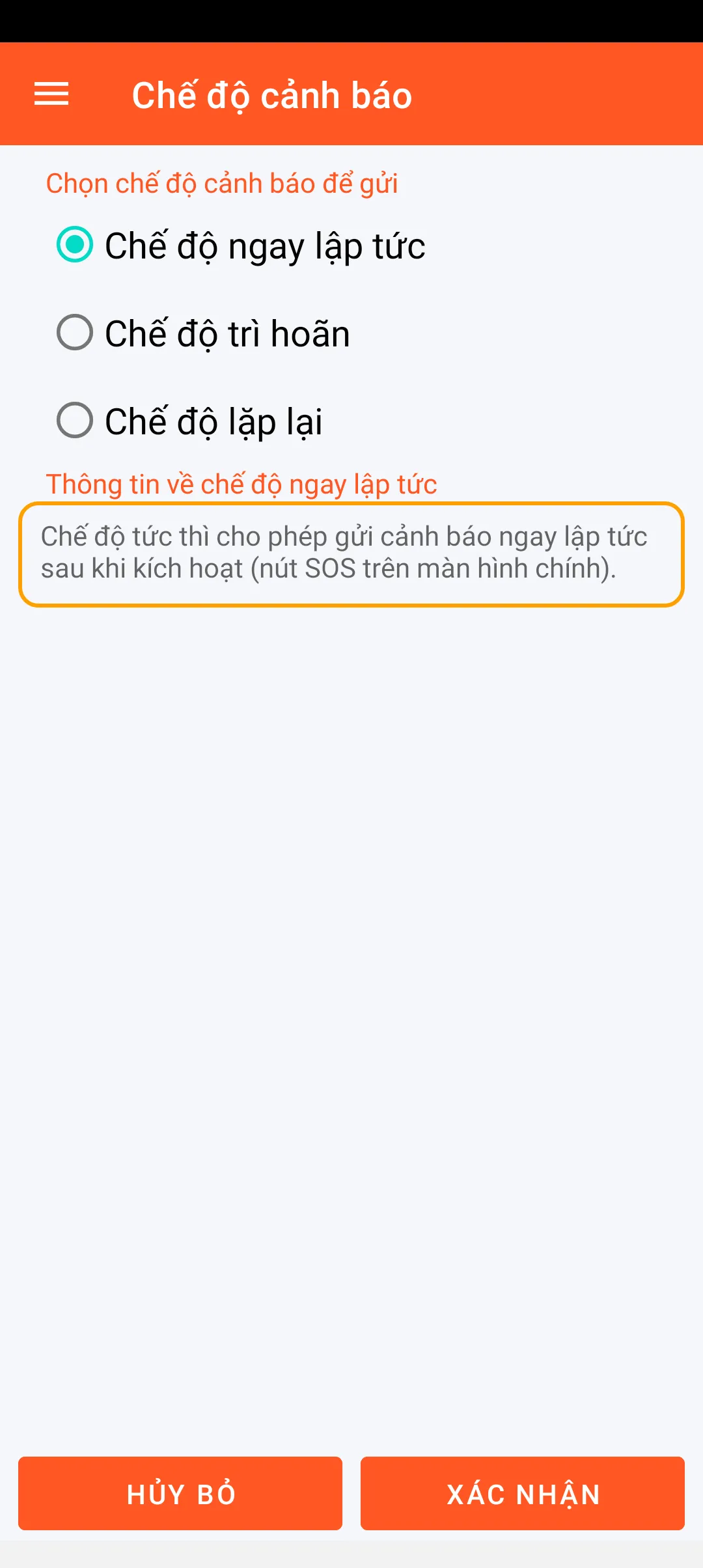 Chế độ tức thì cho phép gửi cảnh báo ngay lập tức sau khi kích hoạt (nút SOS trên màn hình chính).