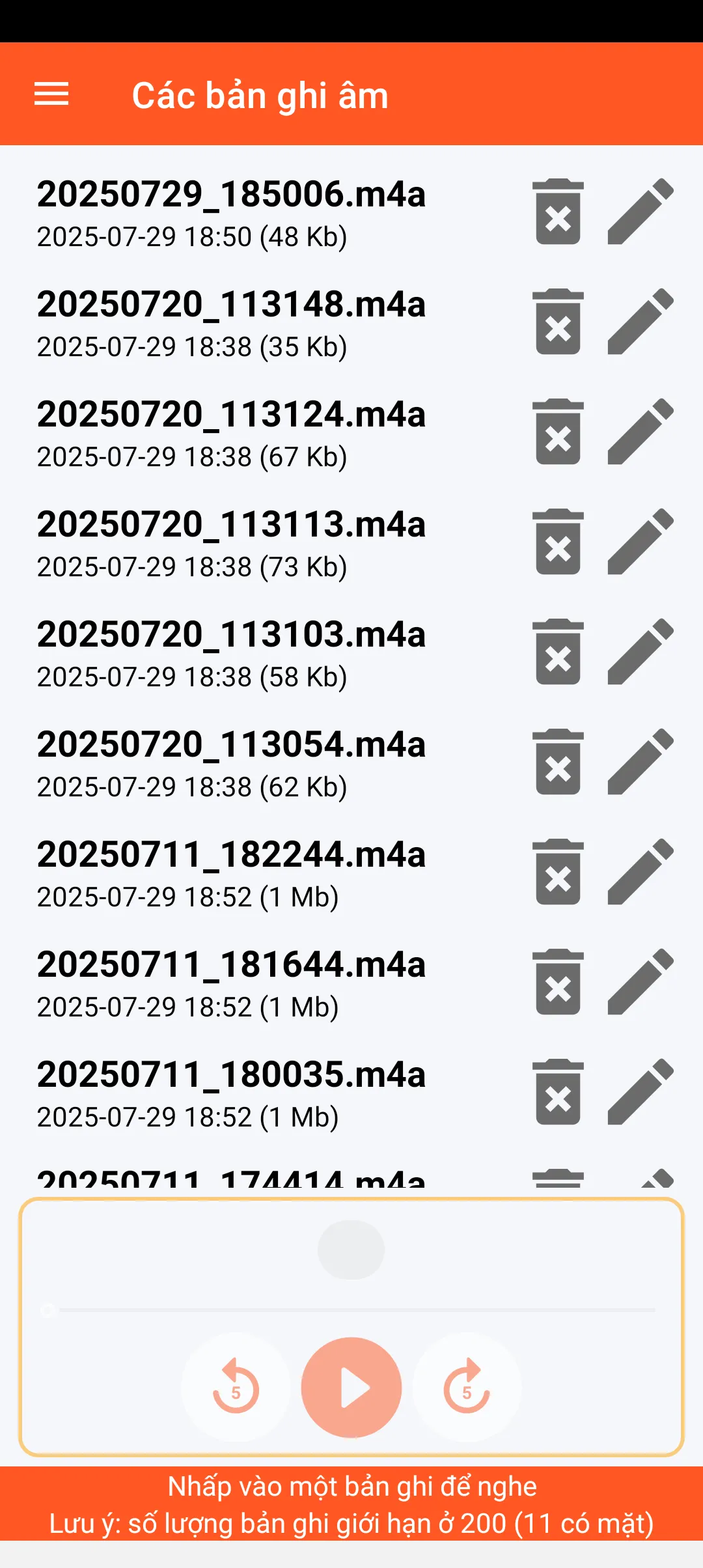 Bạn có thể lưu giữ tối đa 200 bản ghi âm được lưu trữ trong thư mục tải xuống của điện thoại thông minh của bạn. Mỗi bản ghi được ghi thời gian và có thể được nghe, đổi tên hoặc xóa.