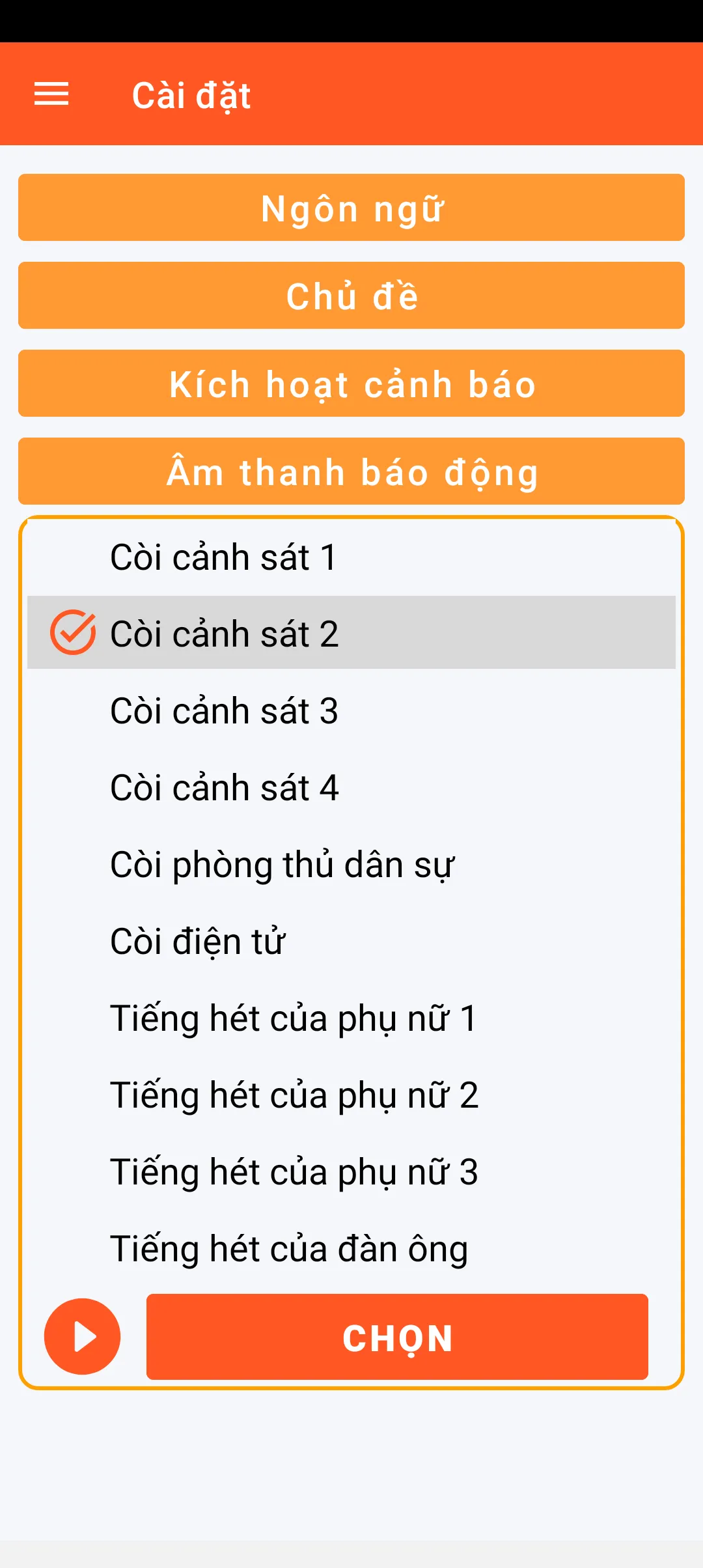 Đối với việc lựa chọn báo động âm thanh, bạn có 6 bản ghi còi báo động và 4 bản ghi tiếng kêu của con người.