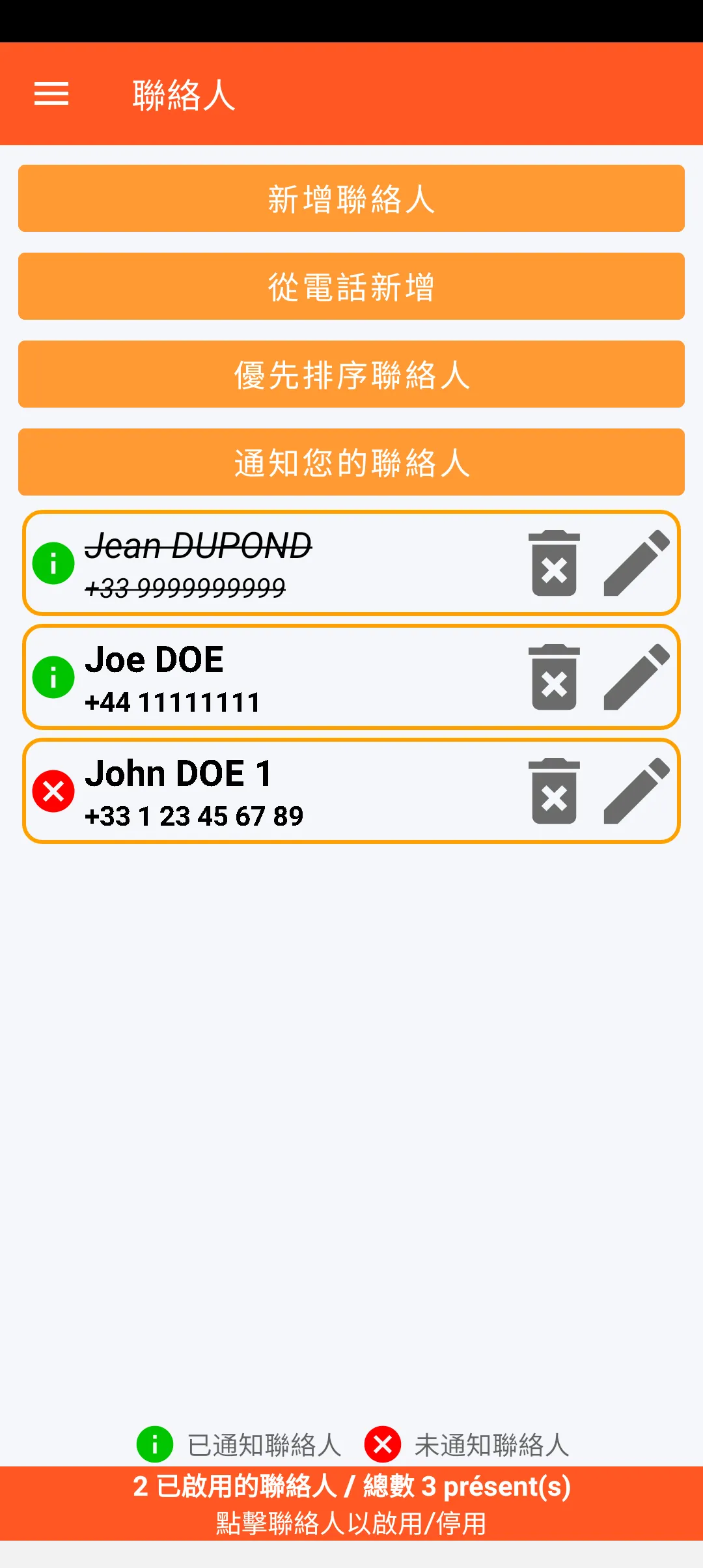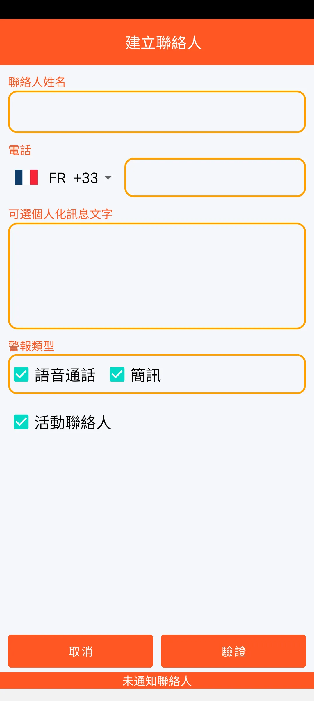 您可以從智慧型手機上的聯絡人中選擇要提醒的信任對象。這些對象可以設定優先順序,並會收到可能收到警報訊息的通知。每個聯絡人都可以暫時停用。