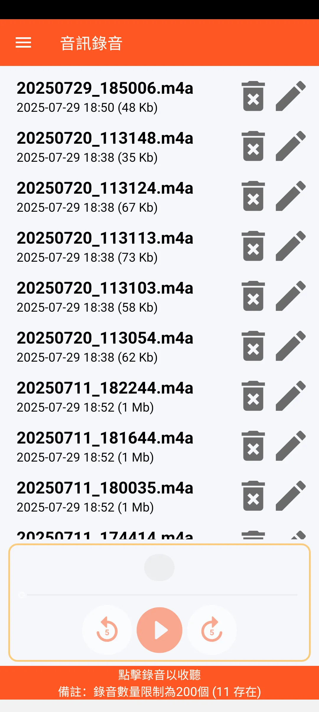 您可以儲存最多200個錄音,這些錄音儲存在智慧型手機的下載目錄中。每個錄音都帶有時間戳,可以收聽、重新命名或刪除。