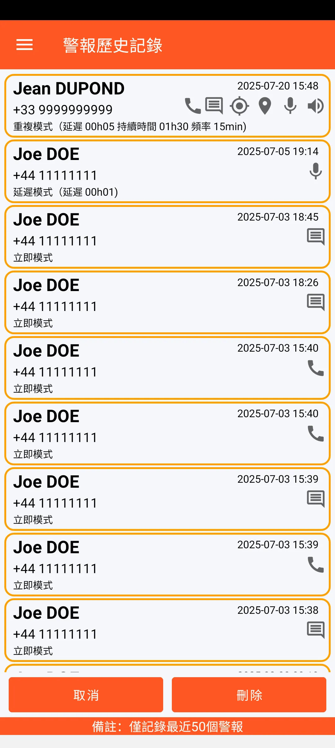 最近50個已發送警報的完整詳細資訊(包括被警報聯絡人的姓名、日期和時間,以及警報內容和模式)都已記錄在案。