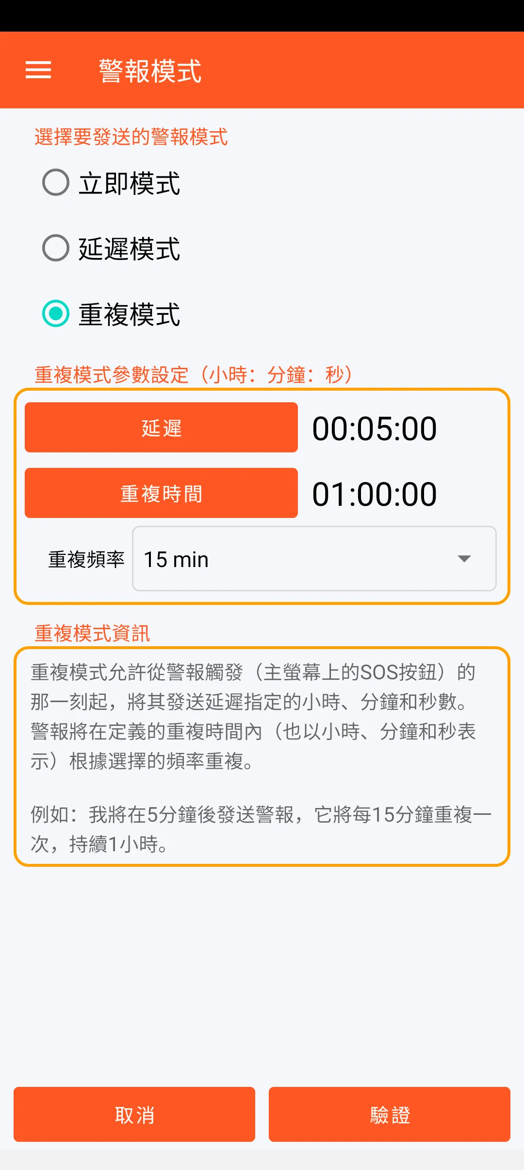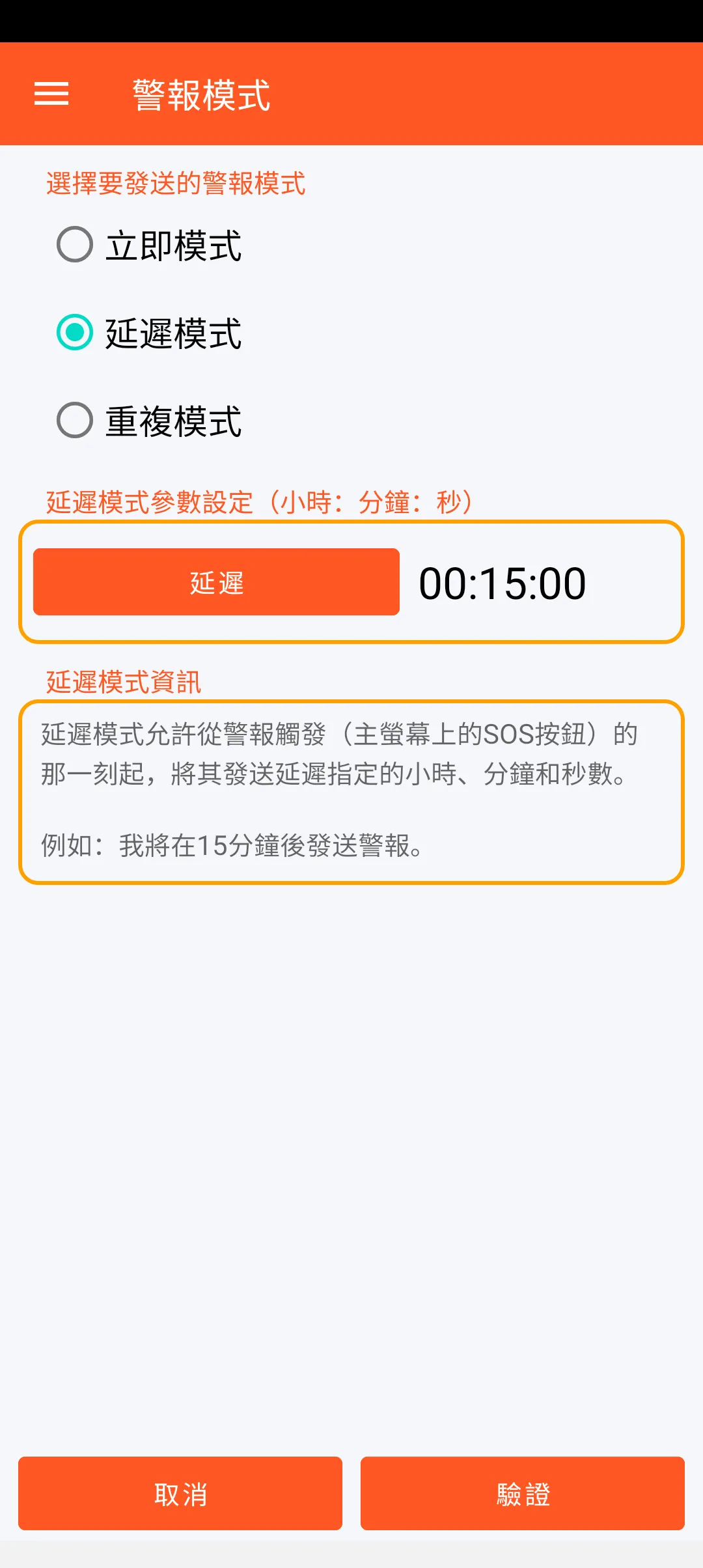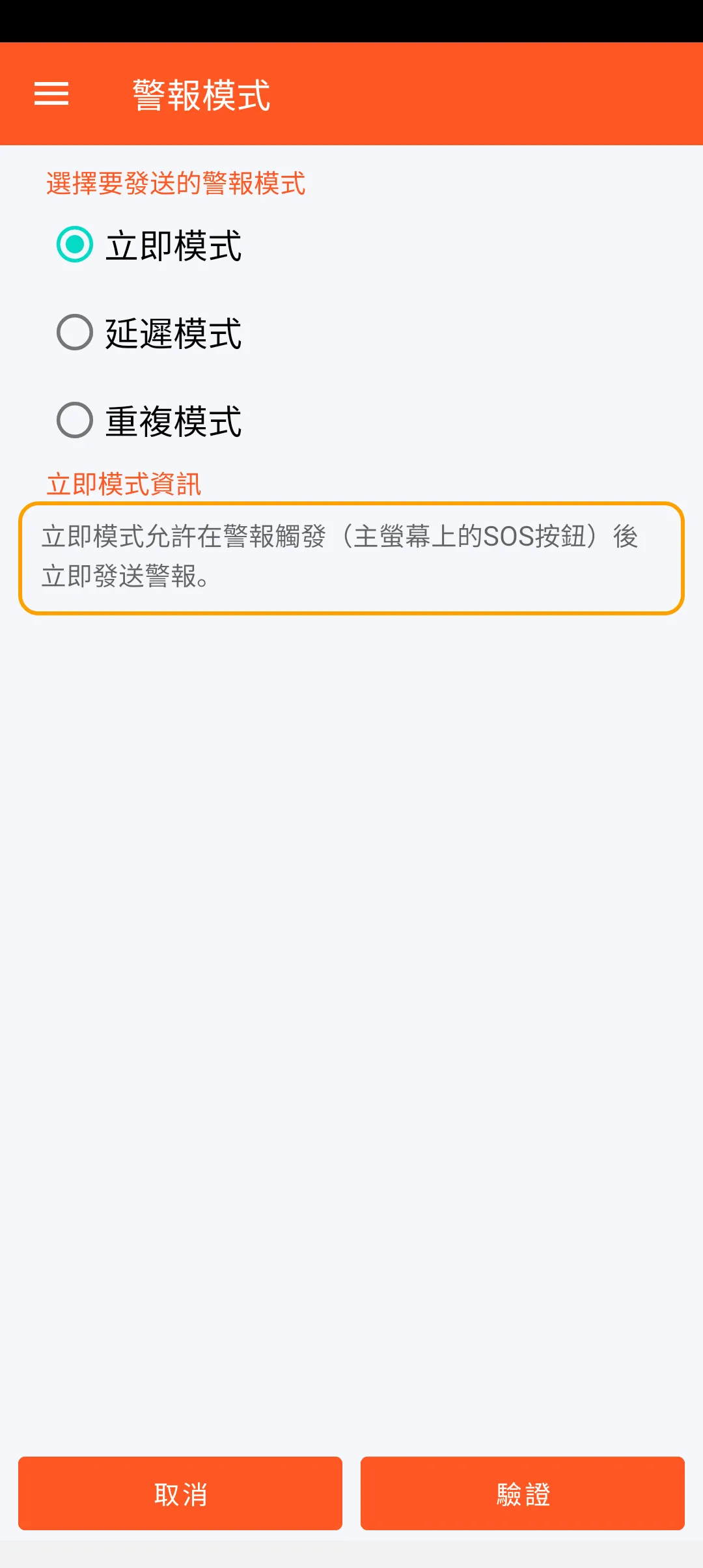 立即模式允許在警報觸發(主螢幕上的SOS按鈕)後立即發送警報。