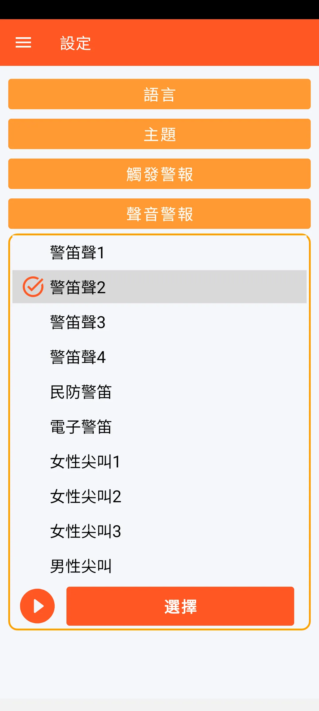 關於聲音警報的選擇,您有6種警笛聲錄音和4種人聲尖叫錄音可供選擇。